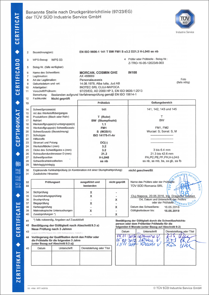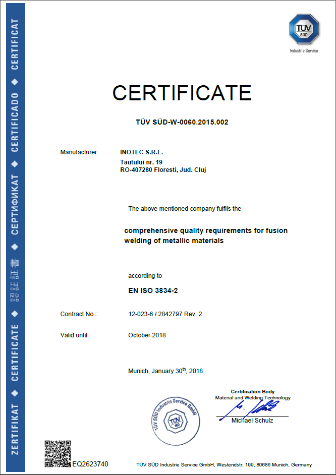 ISO 3834-2:2005 Certification of Inotec defines comprehensive quality requirements for fusion welding of metallic materials both in workshops and at field installation sites and is done by accredited and licensed organization TÜV SÜD Industrie Service GmbH.