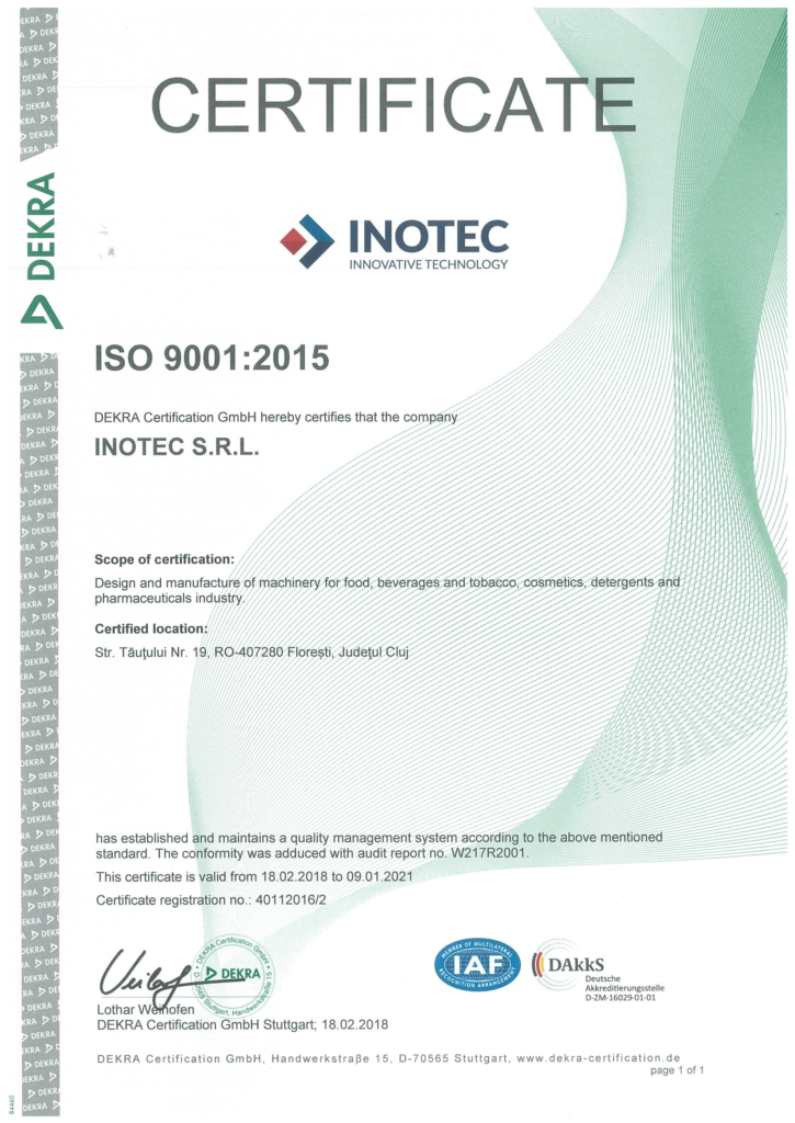 ISO 9001: 2015 Certification of Inotec is achieved for “Design and manufacturing of machinery for food, beverages and tobacco, cosmetics, detergents and pharmaceutical industry” and is done by the accredited and licensed organization DEKRA Certification GmbH.