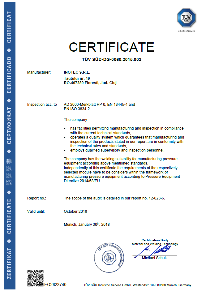 Inotec implements a quality assurance system (QA-system) in accordance with the Pressure Equipment Directive 2014/68/EU, the local and international standards to prove the quality performance as a manufacturer. According to the certificate, Inotec: